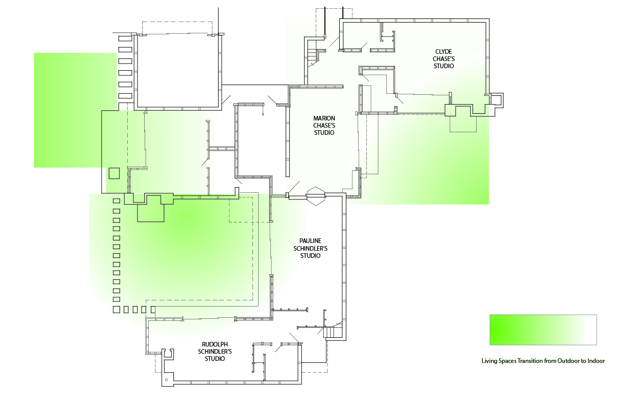 The following is a plan overlaid with garden spaces. Schindler planned for seamless transition to the outdoors, that is why he had glass facing the garden. The glass walls were also easily moved and in some cases removable entirely. The outdoor portions of the plan were also sunken two feet in some areas of the lot to further distinguish them as unique outdoor spaces. Because of Schindler's strategic planning it is easy to see how the green spaces essentially become an extension of the house. The studio combined with the outdoors shares similarities with a tent. Three walls enclosed with the last open for easy outdoor access.